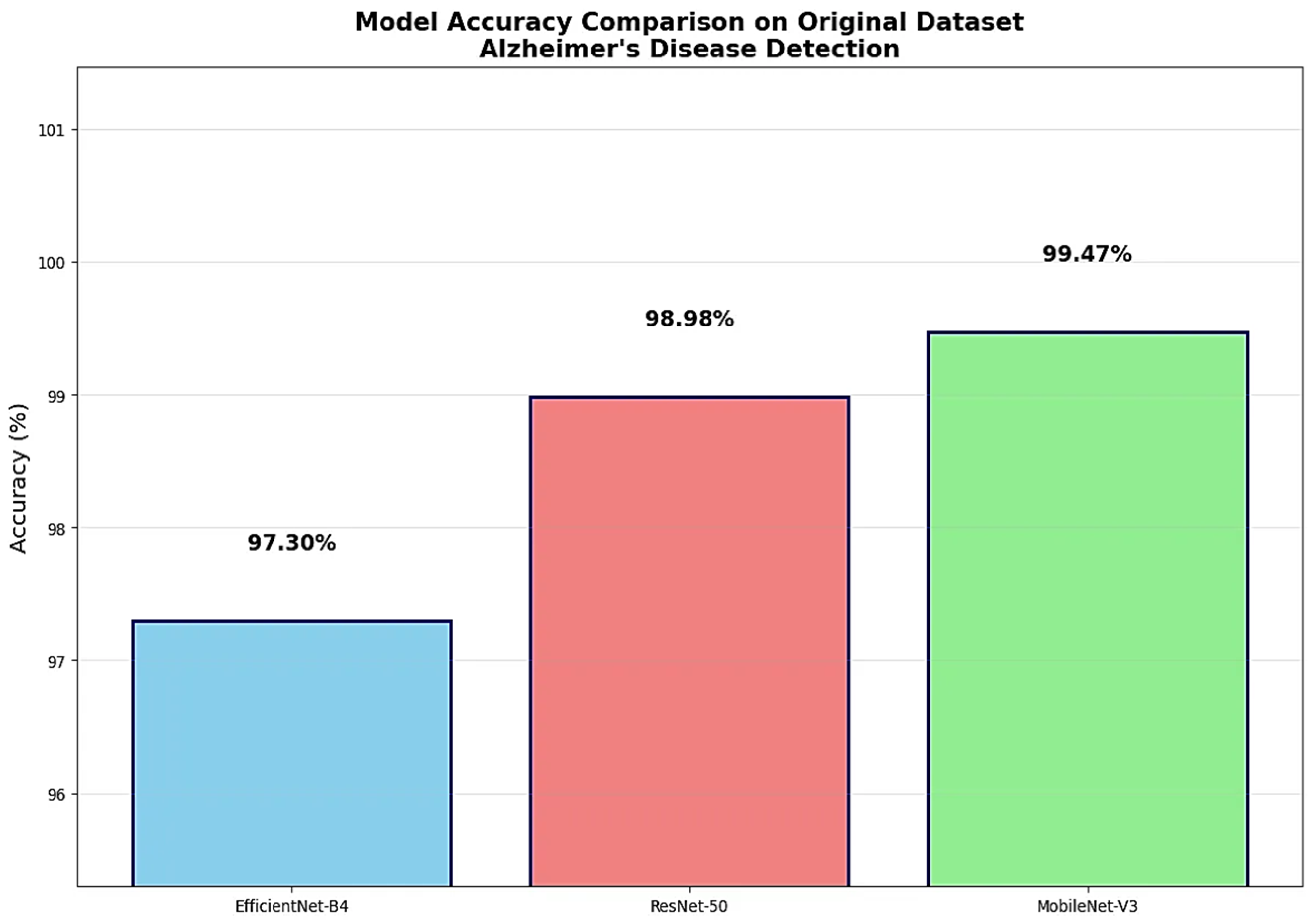 MobileNet-V3 exhibited the strongest overall performance, with an accuracy of 99%, achieving perfect precision and recall (1.00) for both MildDemented and ModerateDemented classes, ensuring flawless identification of critical pathological cases. The model also achieved perfect precision (1.00) and 0.98 recall for NonDemented, and 0.98 precision with perfect recall (1.00) for VeryMildDemented, demonstrating excellent sensitivity and specificity across both early and non-pathological categories.