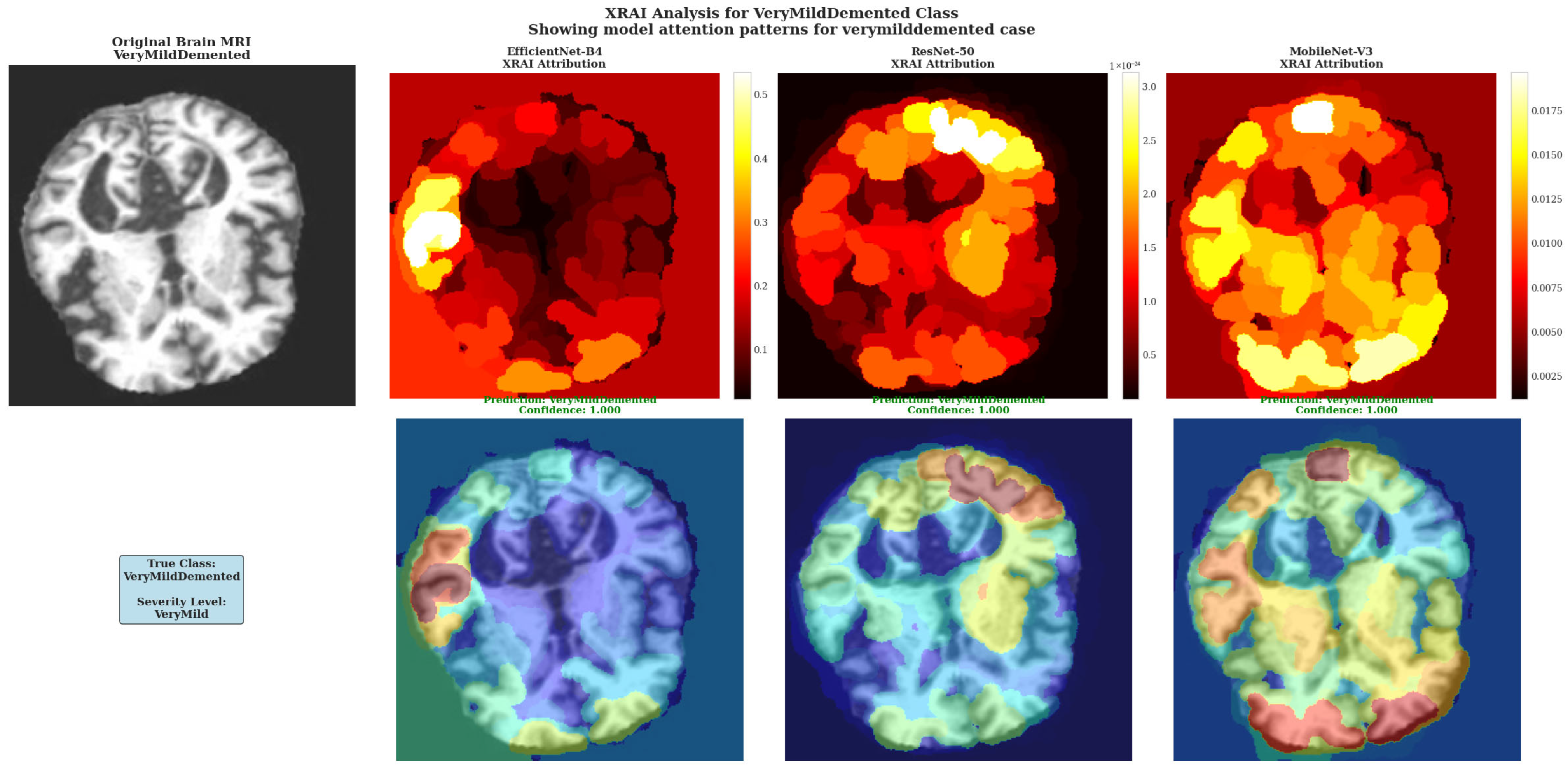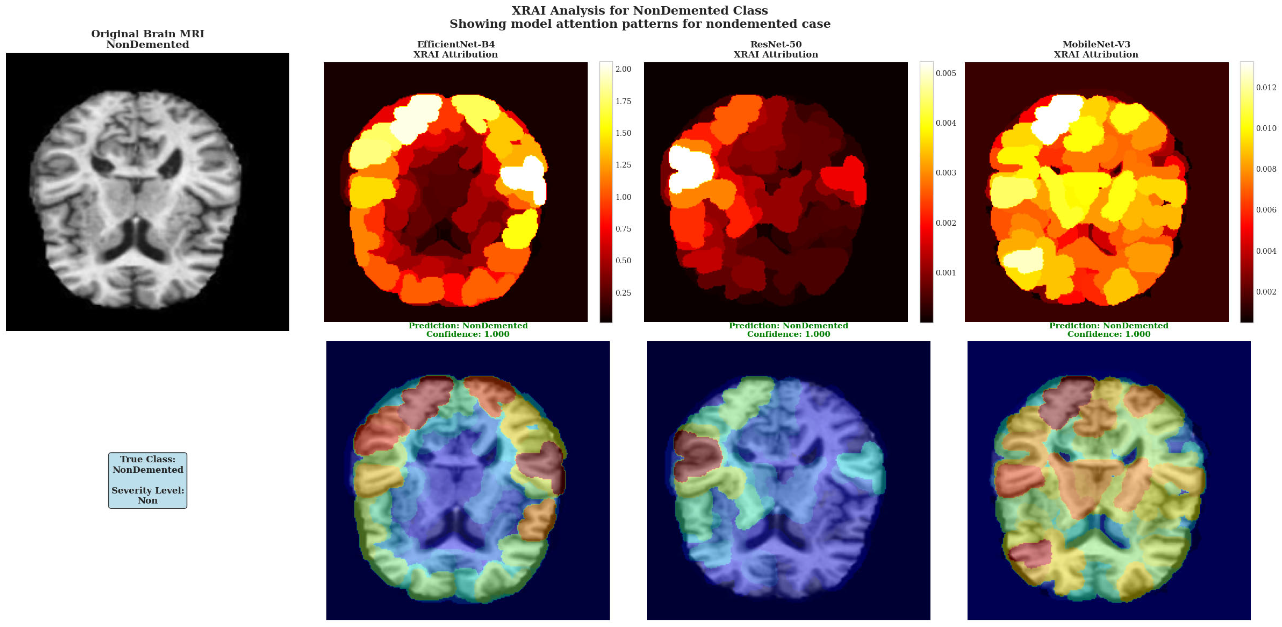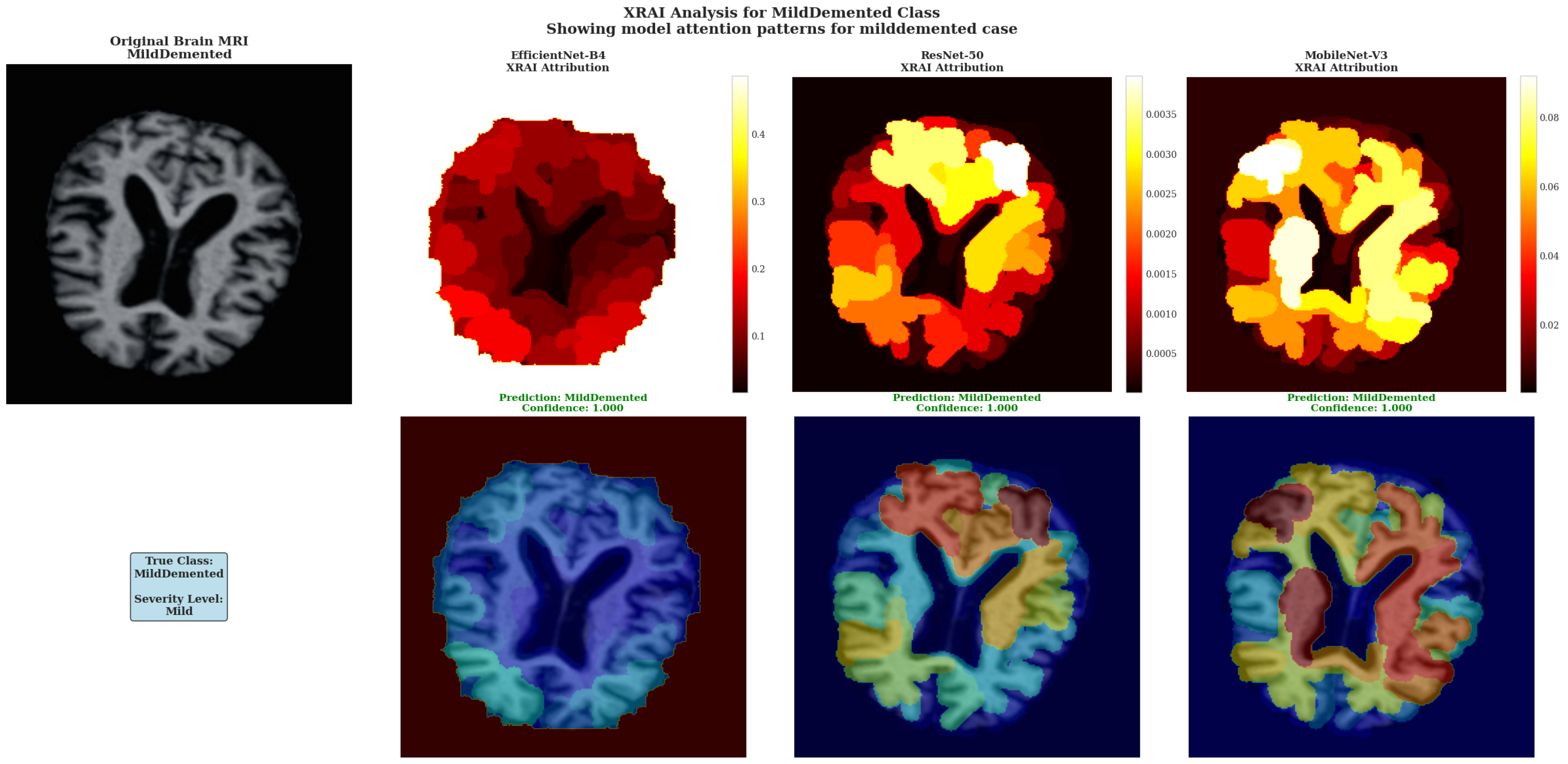 To validate model decision-making processes and provide clinical interpretability for the two-dimensional classification models, comprehensive XRAI attribution analysis was conducted across all three CNN architectures (EfficientNet-B4, ResNet-50, and MobileNet-V3) for each Alzheimer’s disease severity class. It is important to note that the confidence values shown alongside the XRAI maps represent the model’s softmax prediction probabilities and are not outputs of XRAI itself. The explainability analysis aimed to identify which brain regions most significantly influenced classification decisions, compare architectural approaches to feature detection, and assess the clinical relevance of model attention patterns across different dementia severity levels. Each architecture was evaluated using identical XRAI parameters to ensure fair comparison, with attribution maps generated for representative cases from MildDemented, ModerateDemented, NonDemented, and VeryMildDemented classes to capture the complete spectrum of disease progression. The analysis utilized pixel-level attribution scoring to quantify regional importance, enabling systematic comparison of architectural performance and identification of clinically meaningful attention patterns that could guide model selection for clinical deployment.