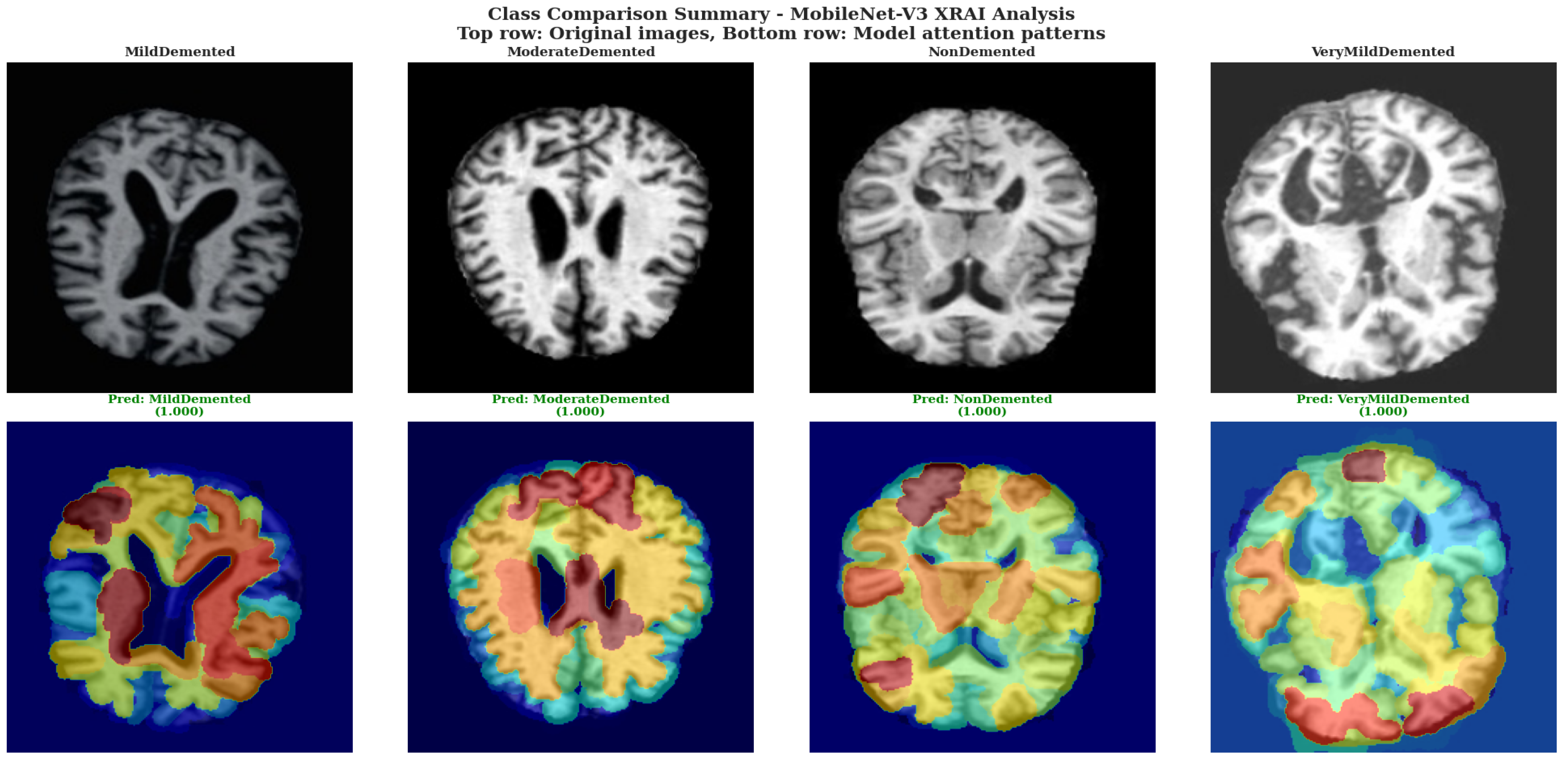 Class Comparison Summary used MobileNet-V3 XRAI Analysis. The top row shows original brain images for each severity class, while the bottom row displays corresponding model attention patterns with prediction confidence scores, demonstrating systematic attention adaptation across the complete spectrum of Alzheimer’s disease severity.