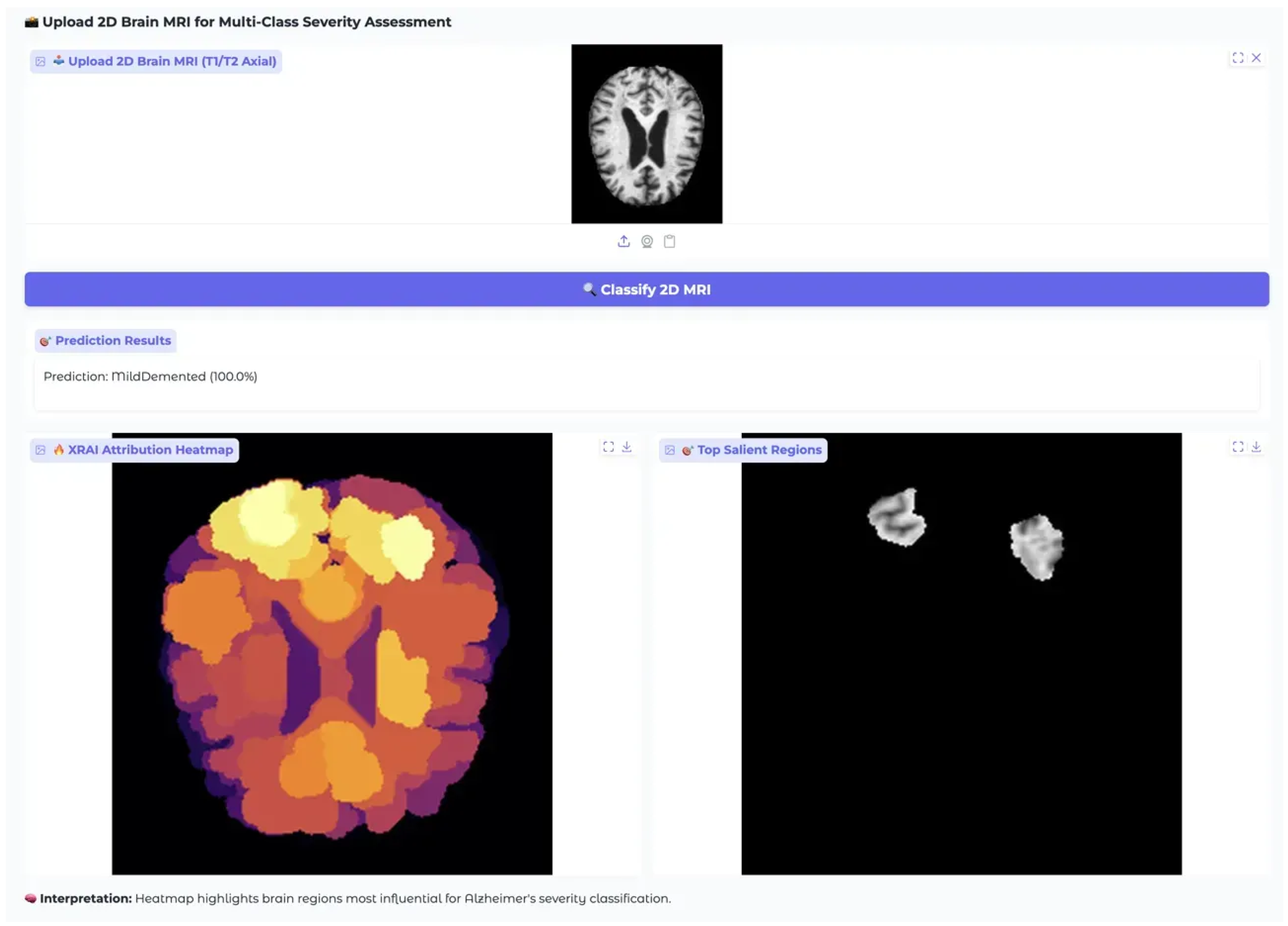 To aid clinical interpretation, the interface provides contextual explanation such as: “Heatmap highlights brain regions most influential for Alzheimer’s severity classification.” This built-in guidance allows clinicians to understand the rationale behind the model’s decision without requiring expertise in ML or attribution methods. The interface also supports a user experience with drag-and-drop image upload, automatic preprocessing, and rapid inference, typically returning results within 20 s on CPU.