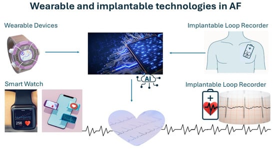 Wearable technologies have further revolutionized AF diagnostics by facilitating continuous cardiac monitoring in real-time outside clinical settings, as seen in Figure 2. Devices such as the Apple Watch, Fitbit, and implantable loop recorders offer extensive longitudinal data collection capabilities. These technologies, integrated with AI models, detect irregular rhythms earlier and alert users promptly, enabling timely clinical interventions and reducing stroke risk significantly [29,35].