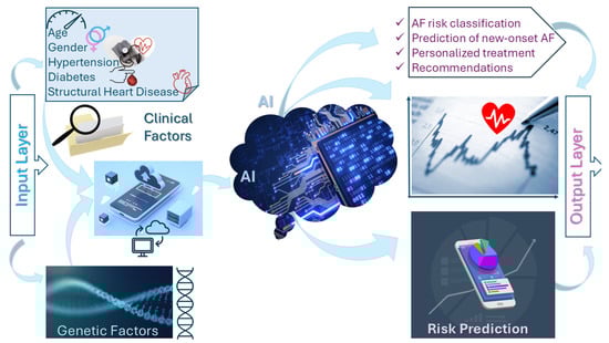 Big data analytics has further augmented the potential of AI in AF risk stratification and prediction. Electronic health records (EHRs) [60], large-scale genetic databases, wearable device datasets, and longitudinal observational data constitute a vast resource for developing robust predictive algorithms. The integration of these diverse data sources into AI algorithms facilitates the identification of subtle and previously unrecognized patterns predictive of AF. For example, the use of big data analytics and machine learning algorithms applied to EHRs and genomic datasets has resulted in significant improvements in AF prediction and individualized patient risk profiles [30,53,61].