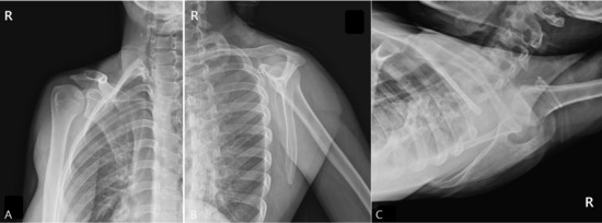 Plain Radiographs of the Right Scapula. These radiographs were taken due to the worsening of wrist symptoms, accompanied by a feeling of instability in the scapular region. (A) True anteroposterior (AP) view of the shoulder, (B) scapular Y-view, and (C) axillary view. All views showed no evidence of a definite fracture line, dislocation, or other specific abnormalities.