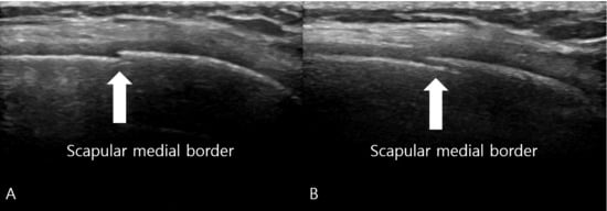 Musculoskeletal Ultrasound of the Right Scapula. (A) Longitudinal view obtained directly over the medial border of the scapula reveals a subtle cortical irregularity (white arrow) indicating the fracture site, which was not visible on plain radiographs. (B) Longitudinal view obtained medial to the scapular border demonstrates a more extensive cortical disruption with a longer fracture line (white arrow), confirming the location of point tenderness and providing additional evidence of the stress fracture. The sonographic finding of cortical disruption, combined with focal tenderness on sonopalpation, led to a provisional diagnosis of a scapular stress fracture.