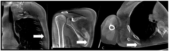 - Cronin, J.T.; Curtis, K.B.; Richards, B.W.; Hibbard, J.N.; Skedros, J.G. Acromion and Clavicle Stress Fractures After Reverse Total Shoulder Arthroplasty Reflect Failure to Address Osteoporosis: A Case Report and Literature Review. Cureus 2025, 17, e79993. [Google Scholar] [CrossRef]