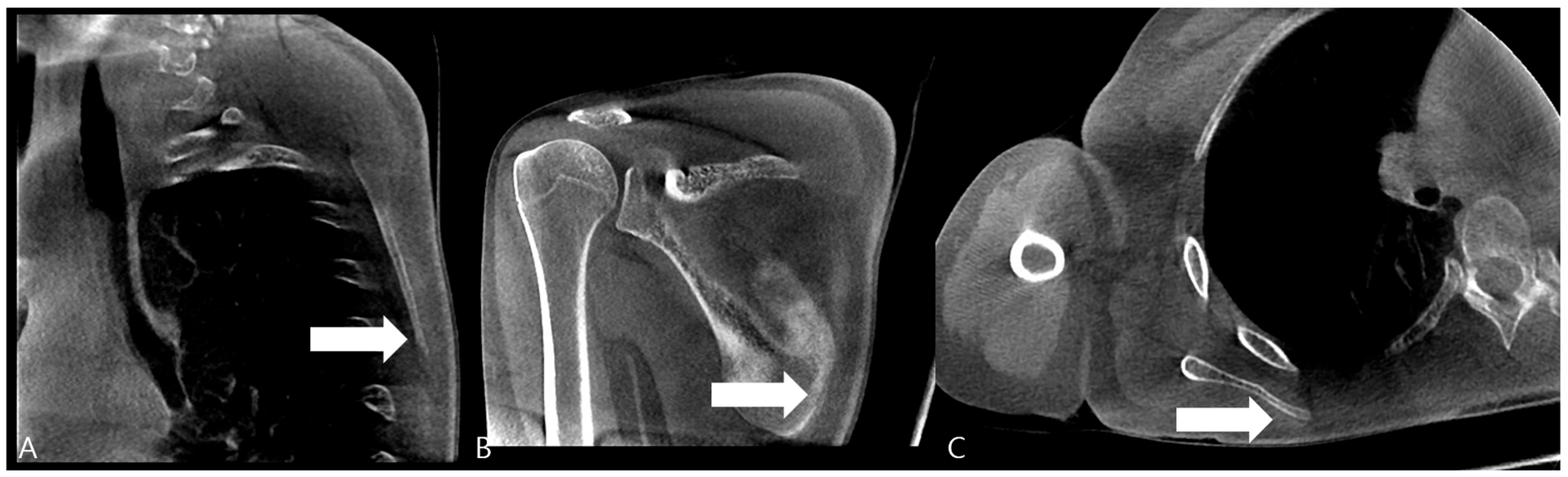 - Levine, B.D.; Resnick, D.L. Stress fracture of the scapula in a professional baseball pitcher: Case report and review of the literature. J. Comput. Assist. Tomogr. 2013, 37, 317–319. [Google Scholar] [CrossRef] [PubMed]