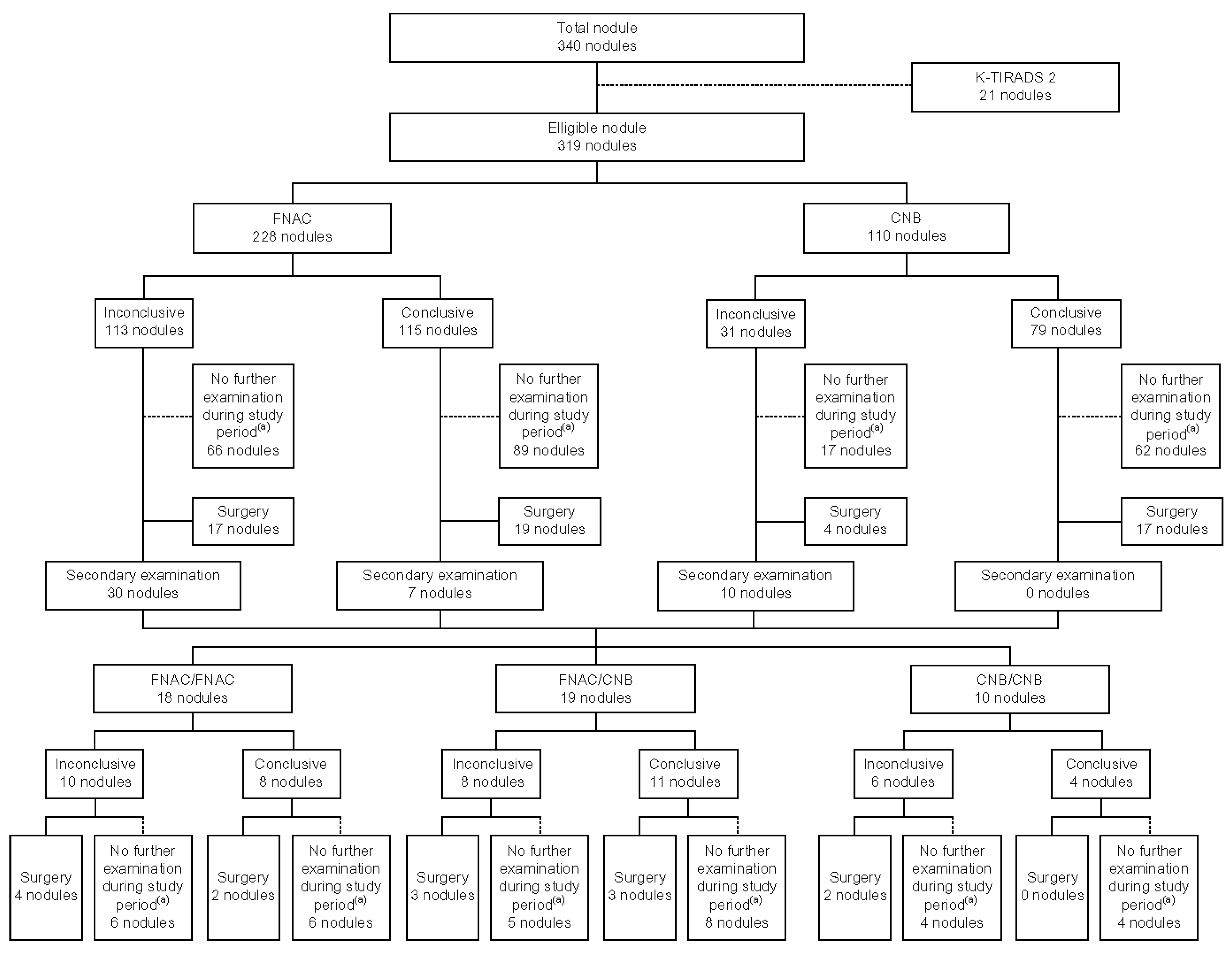 Figure 4. Study flowchart. (a) Reasons for no further examination included loss to follow-up, routine ultrasonographic evaluation only, and referral to another hospital owing to patient preferences. A conclusive result is defined as Category II (benign), Category IV (follicular neoplasm/suspicious for follicular neoplasm), Category V (suspicious for malignancy), and Category VI (malignancy) according to the Bethesda system and 2019 Practice Guidelines for Thyroid Core Needle Biopsy of the Korean Thyroid Association. An inconclusive result is defined as Category I (non-diagnostic) and Category III (atypia of undetermined significance/follicular lesion of undetermined significance) according to the Bethesda system and 2019 Practice Guidelines for Thyroid Core Needle Biopsy of the Korean Thyroid Association. FNAC: Fine-needle aspiration cytology; CNB: Core needle biopsy. Of the nodules included, 19 underwent both FNAC and CNB simultaneously; therefore, the total number of unique nodules is 319.