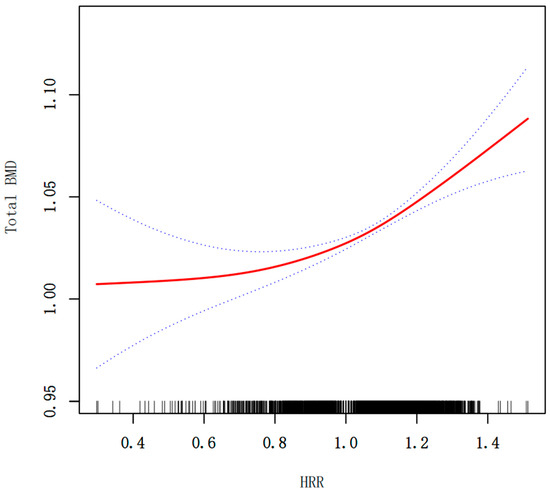 Figure 2. Smooth curve fitting for HRR and total BMD (g/cm2). The relationship between HRR and BMD was tested by the generalized additive model. Blue bands represent the 95% confidence interval from the fit.