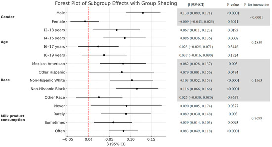 Figure 3 is the association between the HRR and total BMD stratified by age, gender, race, and milk consumption frequency. Stratified analyses revealed a significant interaction by gender (p for interaction < 0.0001) (Figure 3). In males, HRR exhibited a strong positive correlation with BMD, indicating that higher HRR levels were consistently associated with increased total BMD (β = 0.130, 95% CI: 0.089, 0.171, p < 0.0001). In females, HRR had no significant relationship with BMD (β = −0.009, 95% CI: −0.043, 0.025, p = 0.6041). Figure 4 shows the smoothed curve fit of the association between the HRR and total BMD stratified by sex (Figure 4). In addition, significant positive associations between HRR and total BMD were detected in subjects aged 12–15 years, non-Hispanic whites, non-Hispanic blacks, other Hispanics, Mexican Americans, and all milk drinkers (Figure 3).