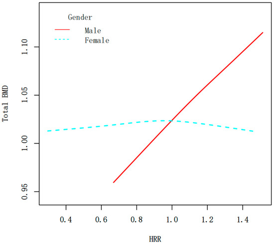 Figure 4. Smooth curve fitting of the HRR and total BMD (g/cm2) stratified by sex. The relationship between HRR and BMD was tested by the generalized additive model.