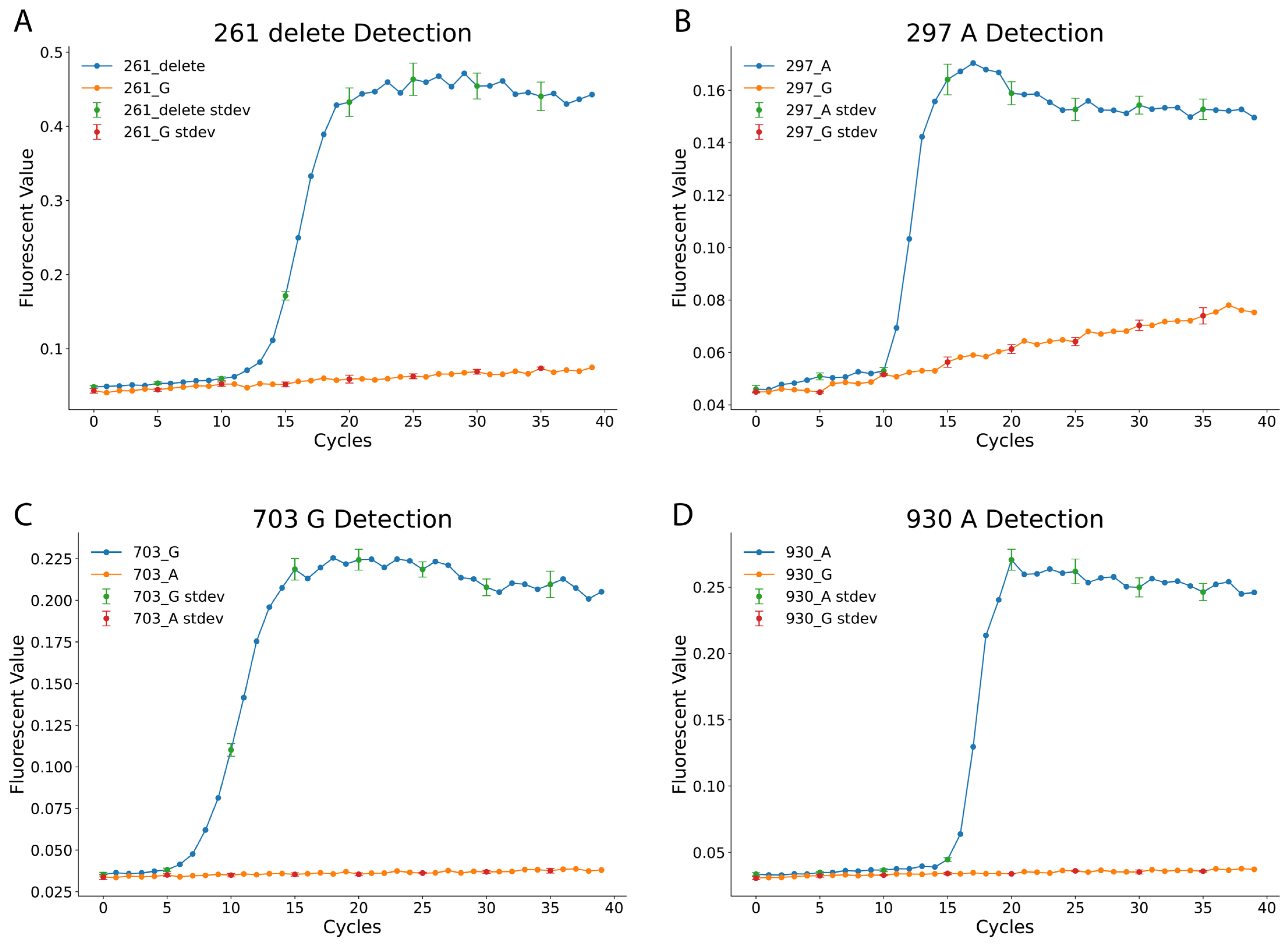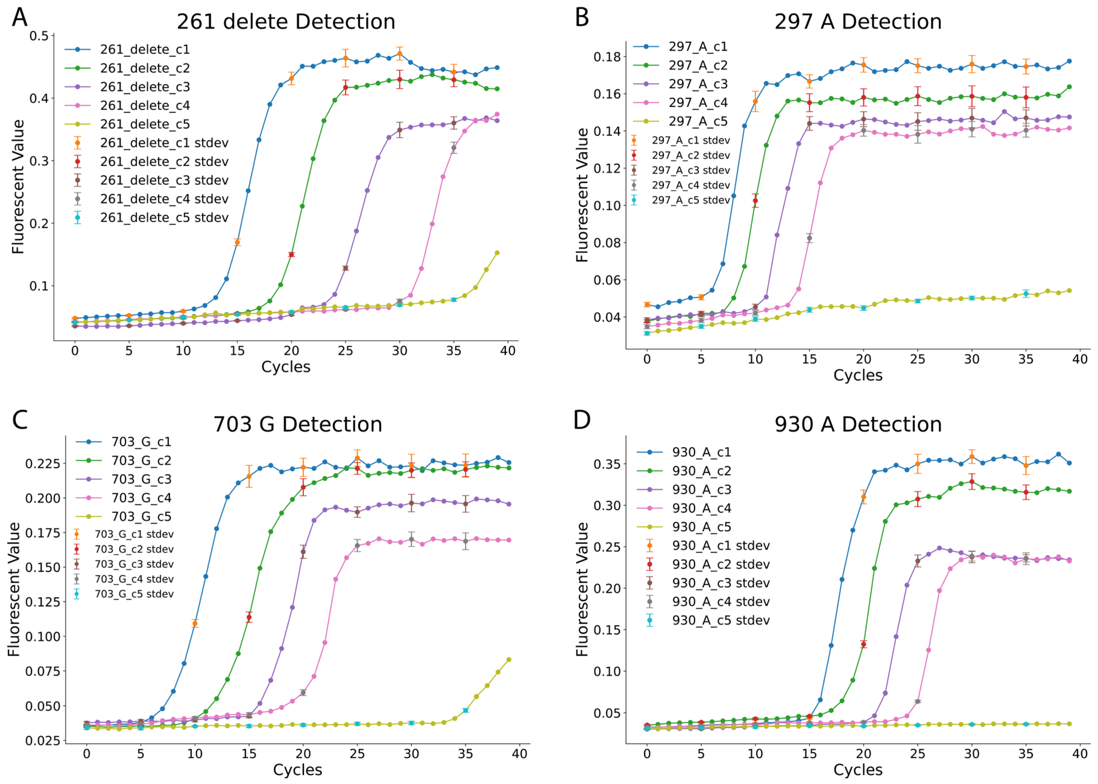 Figure 2 indicate a consistent increase in cycle threshold as sample concentration decreases. The reactions exhibited distinct characteristics: the 297_A and 703_G reactions detected targets within 5–10 min at high concentrations, while the 261_delete reaction required approximately 13 min to detect targets at similar concentrations. The 930_A reaction was the slowest, requiring more time for detection across all concentrations. Despite these variations, consistent detection was observed down to 10 copies within the 40 min reaction time cutoff. In contrast, the 1-copy dilution provided inconsistent signals and was therefore deemed below the reliable limit of detection under our assay conditions, reinforcing the robustness of the assay’s established high sensitivity.