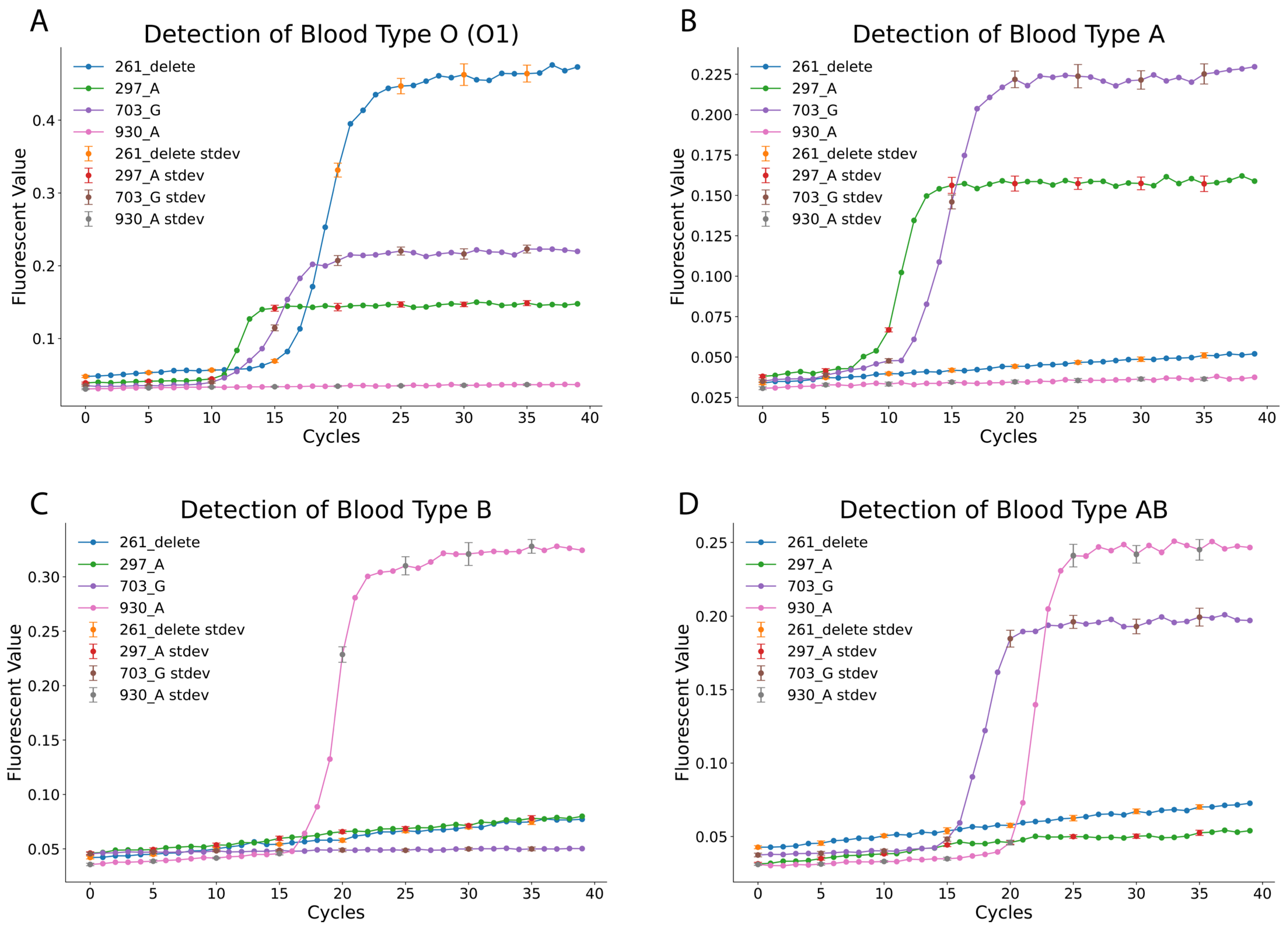 Figure 3) clearly differentiated blood types. For blood type O (O1), positive amplification was observed for the 261_delete, 297_A, and 703_G reactions, while the 930_A reaction remained negative (as summarized in