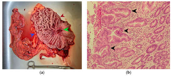 (a) Subtotal gastric resection specimen. The green arrow indicates an ulcerated gastric tumor measuring 3/2.5 cm, the red arrow indicates the lesser curvature of the stomach, and the blue arrow marks the greater curvature of the stomach. (b) Microscopic appearance of the gastric tumor in hematoxylin-eosin staining, magnification ×200; the black arrow indicates areas of moderately differentiated adenocarcinoma on an intensely desmoplastic background.