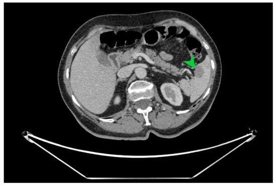 CT image in cross-section on which the well-defined hypodense splenic tumor formation of 23.5/16 mm is indicated with a green arrow, with a high suspicion of splenic metastasis.