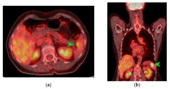 PET-CT images in transverse (a) and coronal (b) sections highlighting an area of metabolic activity in the spleen that raises suspicion of splenic metastasis. The splenic tumor is indicated by the green arrow.
