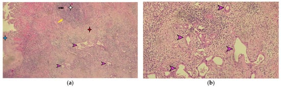 Microscopic appearance of splenic metastasis. (a) Microscopic image of the splenic metastasis of gastric cancer stained with hematoxylin-eosin (H-E), ×40 magnification. The blue star indicates the splenic capsule. The white star indicates the white pulp of the spleen, highlighting the central arteriole indicated by the black arrow and the marginal zone marked by the yellow arrow. The red star indicates the red pulp of the spleen. The purple arrows indicate the metastatic tumor of moderately differentiated gastric adenocarcinoma. (b) Detailed microscopic image of splenic metastasis of moderately differentiated gastric adenocarcinoma in hematoxylin-eosin staining indicated by purple arrows (magnification ×100).