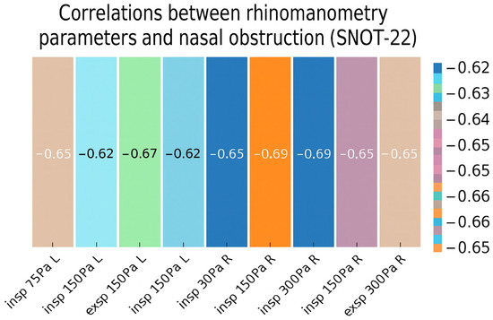 Heatmap of correlations between rhinometry parameters and nasal obstruction.