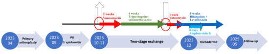 Diagnosis. Unexpectedly, three weeks after the second-stage surgery, microbiological cultures from two out of five intraoperative samples revealed the presence of Trichoderma, a rare fungus not commonly associated with PJI. Trichoderma was identified by microscopy. Given the patient’s immunocompromised status, this finding raised significant concern regarding a possible fungal infection, which could complicate treatment and prognosis. Consequently, an international multidisciplinary consultation involving infectious disease specialists, microbiologists, and orthopedic surgeons was sought to formulate an optimal management plan.