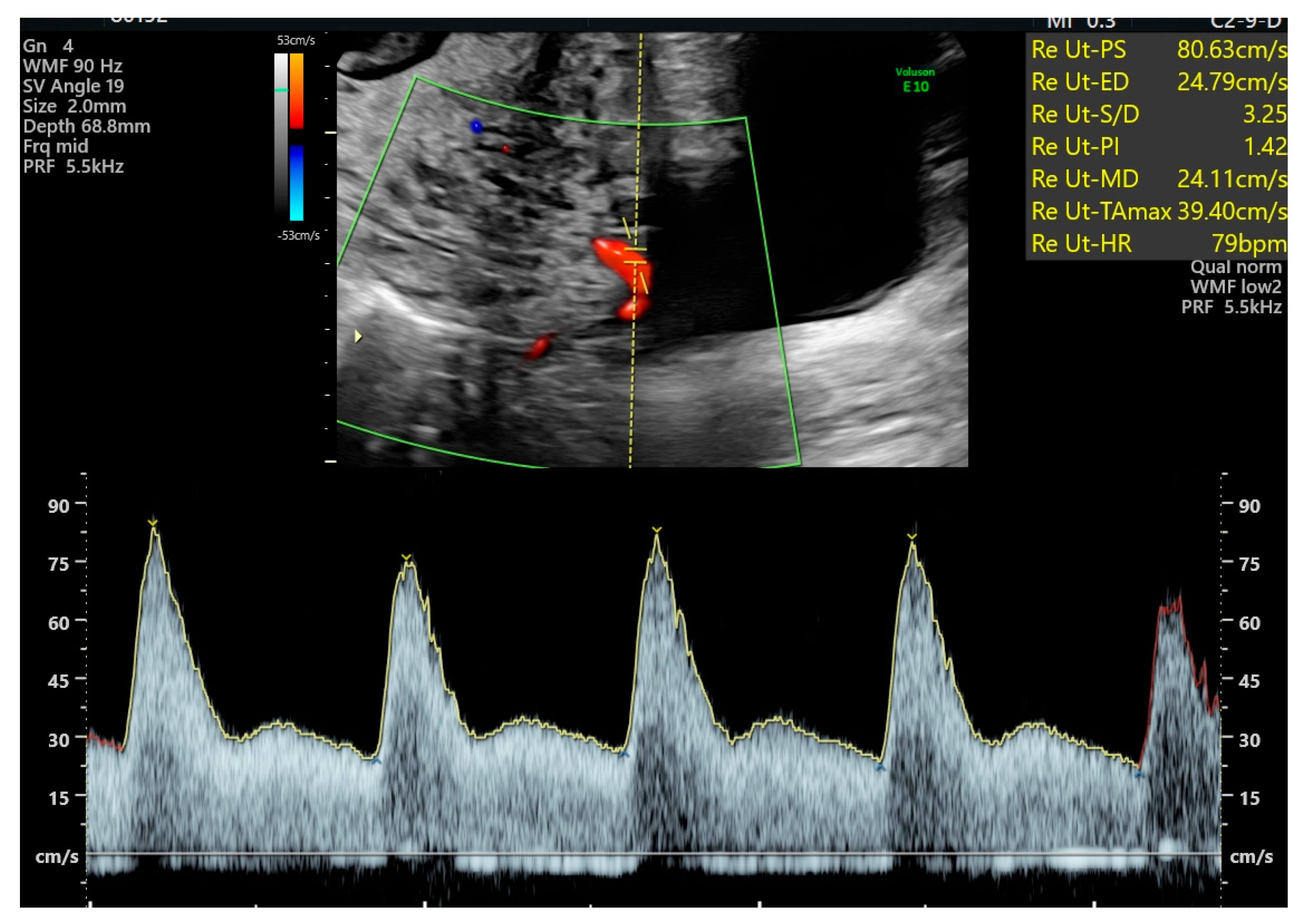 - Klein, K.; Mailath-Pokorny, M.; Elhenicky, M.; Schmid, M.; Zeisler, H.; Worda, C. Mean, Lowest, and Highest Pulsatility Index of the Uterine Artery and Adverse Pregnancy Outcome in Twin Pregnancies. Am. J. Obstet. Gynecol. 2011, 205, 549.e1–549.e7. [Google Scholar] [CrossRef] [PubMed]