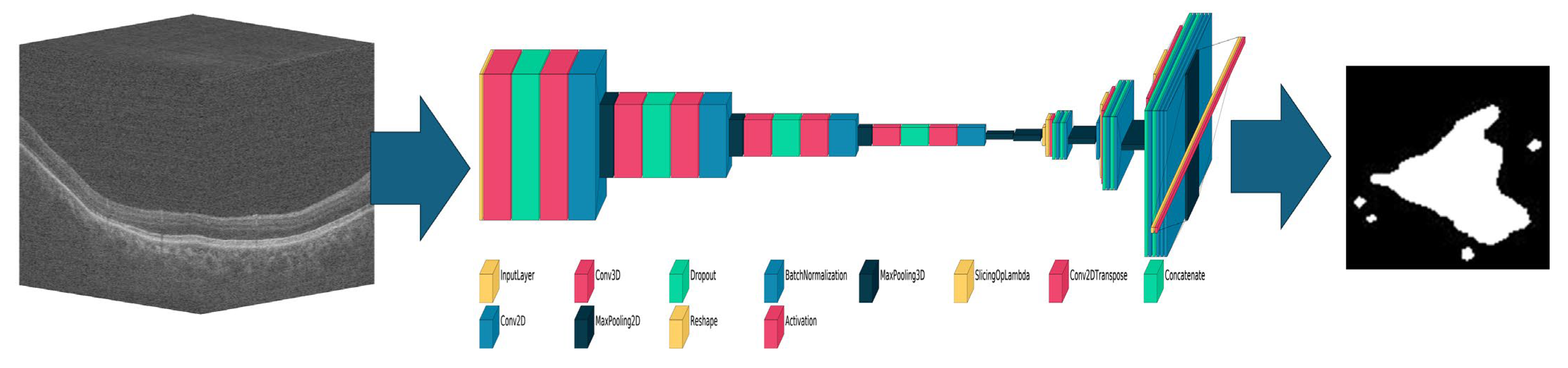 - Lachinov, D.; Seeböck, P.; Mai, J.; Goldbach, F.; Schmidt-Erfurth, U.; Bogunovic, H. Projective Skip-Connections for Segmentation Along a Subset of Dimensions in Retinal OCT. In Proceedings of the Medical Image Computing and Computer Assisted Intervention—MICCAI 2021: 24th International Conference, Strasbourg, France, 27 September–1 October 2021; Proceedings, Part I. pp. 431–441. [Google Scholar]