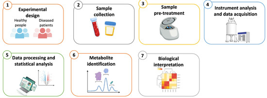In practice, metabolomics analyzes small molecule metabolites (≤1500 Daltons) in a biological material. It entails the concurrent identification of multiple compounds, primarly based on the chemical characteristics and/or atomic weights of the molecules. The field of metabolomics has significantly benefited from recent technological advancements in instrumentation, resulting in more cost-effective devices with a reduced footprint. Intuitive software and large datasets have facilitated the rapid and precise processing of data. Additionally, numerous open-source software programs are available for analyzing metabolomics data [96]. In general, all metabolomics investigations typically involve several steps, including sample collection and pre-treatment, instrumental analysis, and data processing (Figure 3).