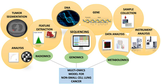 In this review, we provide an overview of current and future opportunities of Omics technologies in cancer. In particular, the attention will be focused on the application of genomics, metabolomics, and radiomics in lung cancer (LC), which still represents the most lethal type of tumor with the highest mortality rate [14]. In fact, with an incidence of more than two million new cases per year, lung cancer represents the most commonly diagnosed cancer worldwide in males (1.57 million new cases) and the second most diagnosed cancer in females (0.91 million new cases), and is the leading cause of cancer-related deaths globally [15]. Lung cancer is classified as small-cell lung cancer (SCLC) or non-small-cell lung cancer (NSCLC) based on distinct biological characteristics: among them, NSCLC accounts for over 80% of all cases, most of which are diagnosed at advanced stages [16]. For early-stage and operable NSCLC (Stages I and II), the average 5-year survival rate is between 50 and 70%. However, for individuals where tumors have metastasized, the five-year survival rate drops to 30% in Stage III with lymph node involvement and falls to 2–5% in Stage IV metastatic disease [17,18]. The high death rate from lung cancer is a result of the difficulty in making a precise and prompt early diagnosis [19,20].