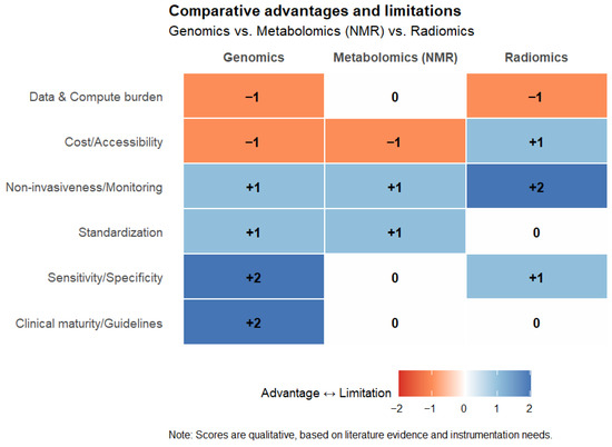A comparative heatmap in Figure 6 summarizes the advantages and limitations of genomics, metabolomics, and radiomics across key evaluation dimensions. This visual overview highlights the heterogeneity of these approaches, the advanced instrumentation required, and the complementary nature of the information they deliver, thereby underlining the importance of their integrative use in precision medicine.