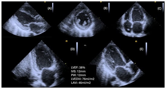 Patient with T2DM and advanced DBCM, causing left ventricular hypertrophy and systolic dysfunction. (A) Parasternal long axis view, (B) Parasternal short axis view (level of papillary muscles), (C) Apical four-chamber view, (D) Apical two-chamber view, (E) Apical long axis view (Original images from authors’ institutions).