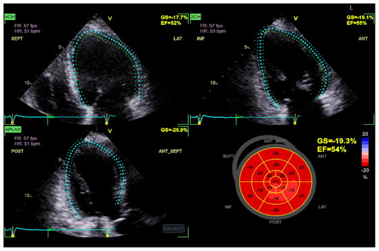 STE has emerged as a valuable imaging modality in detecting subclinical myocardial dysfunction in DBCM [68]. Traditional echocardiographic parameters, such as LVEF, often remain within normal limits in the early stages of DBCM, limiting their utility in identifying subtle myocardial abnormalities [69]. In contrast, STE enables the quantification of myocardial deformation by assessing global and segmental strain patterns, thereby offering superior sensitivity in detecting early systolic and diastolic dysfunction [69,70] (Figure 3). Among the various strain parameters, GLS has been extensively validated as a robust marker of myocardial dysfunction. Several studies have demonstrated that diabetic patients exhibit significantly reduced absolute GLS values compared to non-diabetic controls, even when LVEF is preserved [6,71]. A GLS value above −18% is considered indicative of early myocardial impairment, correlating with both metabolic dysregulation and cardiovascular risk [72]. Furthermore, longitudinal strain impairment has been shown to precede changes in circumferential or radial strain, highlighting the vulnerability of longitudinal subendocardial fibers to diabetic metabolic disturbances, fibrosis, and microvascular dysfunction [72,73].