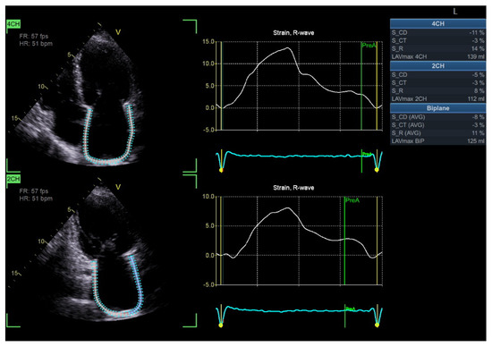 - Georgievska-Ismail, L.; Zafirovska, P.; Hristovski, Z. Evaluation of the role of left atrial strain using two-dimensional speckle tracking echocardiography in patients with diabetes mellitus and heart failure with preserved left ventricular ejection fraction. Diab. Vasc. Dis. Res. 2016, 13, 384–394. [Google Scholar] [CrossRef]
