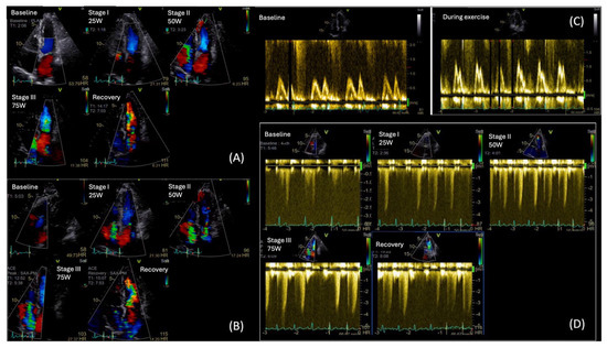 During exercise, a rise in E/E′ and an increase in TR peak velocity (TRVpeak) are often observed in patients with HFpEF, reflecting an abnormal surge in LVFP and PASP, respectively. As heart rate rises, the impaired relaxation in diabetes leads to a disproportionate rise in LVFP and pulmonary pressures, exposing diastolic abnormalities not evident at rest [91,92,93]. Notably, according to the ESC consensus criteria, an exercise E/e′ ≥ 15 and/or TRVpeak > 3.4 m/s are indicative of HFpEF during stress [90]. Moreover, ESE may show an inadequate increase in stroke volume despite rising LVFP, differentiating cardiac limitations from non-cardiac causes of exercise intolerance (Figure 6).