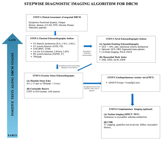 To address these gaps in this review we propose a stepwise multimodality imaging algorithm (Figure 7), which integrates conventional echocardiography, advanced echocardiographic indices, stress echocardiography and complementary imaging modalities to support the early diagnosis and risk stratification of DBCM.
