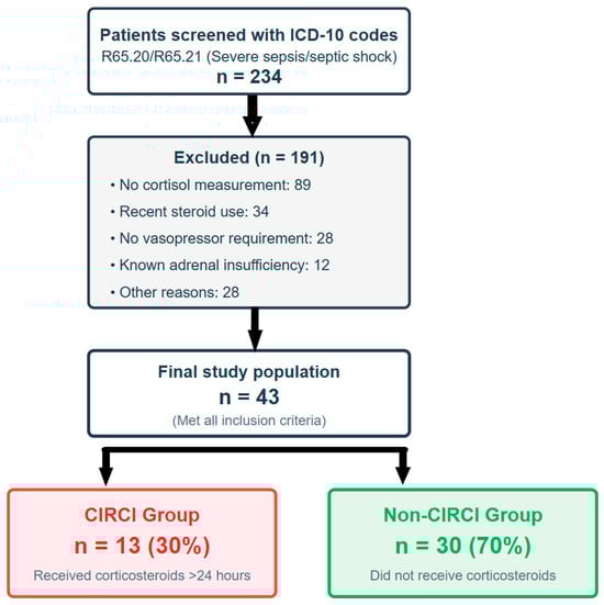 Patient selection flowchart following STROBE guidelines. Flowchart of patient selection from 234 screened patients with severe sepsis/septic shock (June 2012–June 2022). Patients clinically identified as having critical illness-related corticosteroid insufficiency (CIRCI) were in the CIRCI group and received corticosteroids for >24 h, while the non-CIRCI group did not.