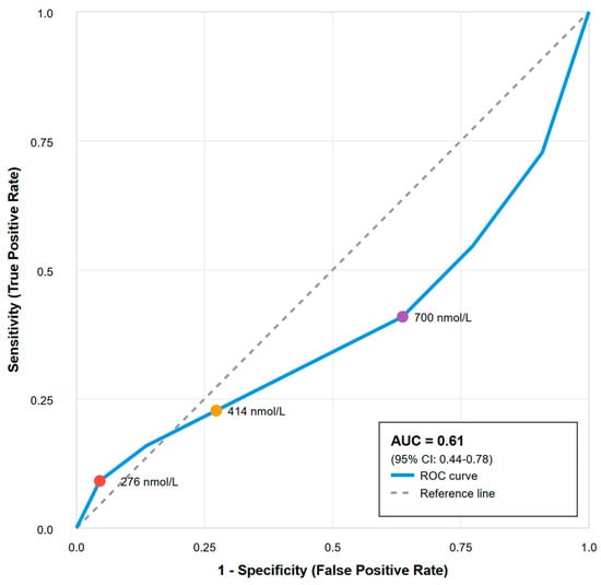 Receiver operating characteristic curve for prediction of critical illness-related corticosteroid insufficiency. Receiver Operating Characteristic curve analysis evaluating the diagnostic performance of baseline cortisol levels for predicting clinically defined critical illness-related corticosteroid insufficiency (CIRCI). Key cut-off values for cortisol (276, 414, and 700 nmol/L) are marked on the curve. Area under the curve (AUC) = 0.61 (95% CI: 0.44–0.78), indicating poor discriminatory ability. The diagonal grey dashed line represents the “Line of No Discrimination” or reference line, which shows the expected performance of a random classifier (AUC = 0.5) that has no diagnostic value whatsoever.