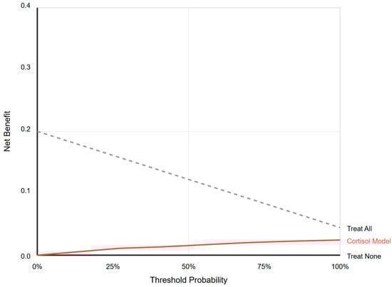 Decision curve analysis. Net benefit analysis comparing cortisol-guided treatment versus treating all or none. The cortisol model provides no clinical utility at any threshold probability.