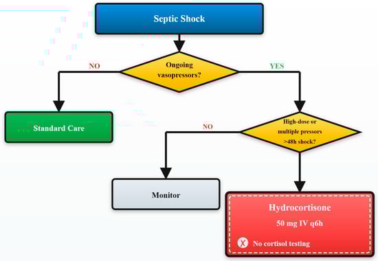 - Annane, D.; Pastores, S.M.; Rochwerg, B.; Arlt, W.; Balk, R.A.; Beishuizen, A.; Briegel, J.; Carcillo, J.; Christ-Crain, M.; Cooper, M.S.; et al. Guidelines for the diagnosis and management of critical illness-related corticosteroid insufficiency (CIRCI) in critically ill patients (Part I): Society of Critical Care Medicine (SCCM) and European Society of Intensive Care Medicine (ESICM) 2017. Intensive Care Med. 2017, 43, 1751–1763. [Google Scholar]