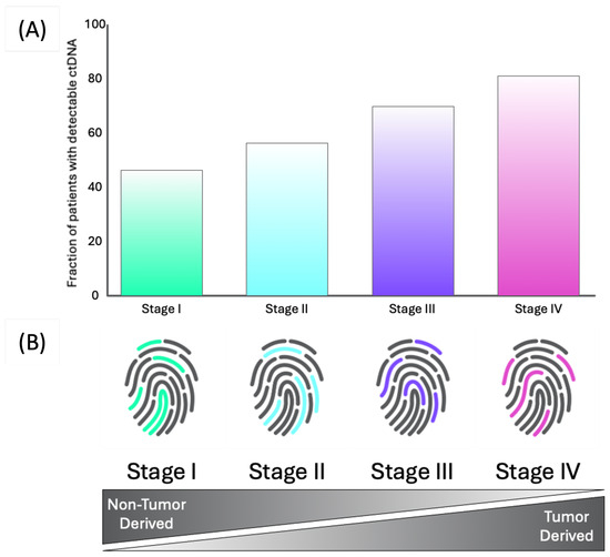 The difference in model sensitivity when using only tumor-derived information, compared with using the IR spectral signature as ML features. (A) The fraction of detectable ctDNA in patients. Adapted from [67]. (B) Different contributions of tumor and non-tumor-derived information across the stages gives each stage a different spectroscopic fingerprint.