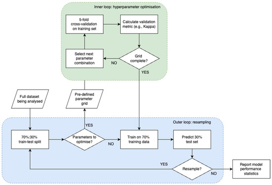 Given the need to repeat both model training and model testing to avoid sampling bias, an efficient experimental design is nested cross-validation, which also prevents data leakage by ensuring that the test set is not used in model training or optimisation. Figure 3 demonstrates an example workflow of nested CV.