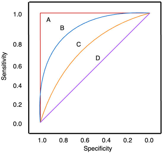 Example ROC curve. (A) A perfect classifier with an AUC of 1. (D) Has an AUC of 0.5, representing a random classifier. (B, C) have AUCs that lie between these extremes, with (B) having a higher AUC than (C) and therefore a better overall model performance. Adapted from [93].