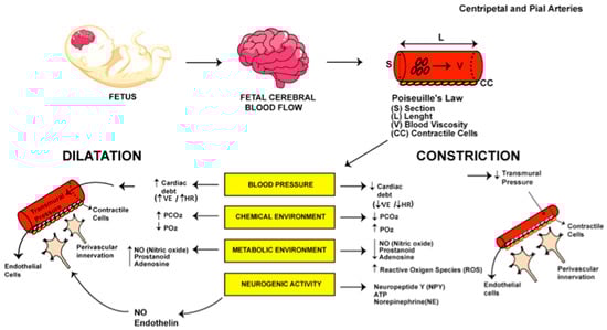 As an extremely sensitive organ, particularly during in utero development, the brain has intrinsic systems to reduce the risk of cerebral damage in cases of insult, such as energy deprivation, due to a mechanism of positive balance in cerebral oxygen–energy substrate demand and supply. This mechanism is called cerebral autoregulation and is present in both the fetal and adult brain. The process of autoregulation of blood flow is based on the principles of Poiseuille’s Equation, according to which blood flow is dependent on four variables: the pressure gradient between the vessel, its section size, length, and blood viscosity. For a given blood viscosity and arterial length, the process of autoregulation depends on changes in vessel section size and pressure gradient through the vessel. It is achieved through the contractile and relaxation properties of these vessels [33]. In fact, arteries constrict in response to an increase in transmural pressure and dilate in response to a decrease in pressure, thereby maintaining stable blood flow within a range of arterial blood pressures. For this reason, this mechanism is also referred to as pressure-flow reactivity [16,34]. As shown in Figure 2, CBF depends on resistance of blood vessels and the perfusion pressure, which is created particularly by cardiac output in fetuses, but also by heart rate. Resistance of blood vessels is a result of vessels’ limited section size and blood viscosity, and is promptly modifiable by the variation in the diameter of arteries and arterioles in each organ through variations in blood pressure, chemical environment (carbon dioxide arterial partial pressure (pCO2) and oxygen arterial partial pressure (pO2)), metabolic environment (functional activation), and neurogenic activity [34]. In the cerebral territory, vascular resistance is primarily determined by arterioles, with contributions from the centripetal arteries that penetrate the cerebral mantle, as well as the pial arteries. It is assumed that shear stress at the endothelial level in the resting state is constant across vessel size and development. For this reason, the conduit arteries of the newborn brain will make a more significant contribution to vascular resistance than the germinal matrix pre-capillary arteries, since the muscular characteristics of pre-capillary arteries are not fully developed until late in fetal life [34]. The main differences between fetal and newborn CBF and autoregulation are evident at the moment of transition to extrauterine life. They are clearly influenced by gestational age at delivery and concomitant obstetric pathological conditions, reflecting the varying degrees of maturation of the fetal cerebral vasculature [35,36]. In fact, those differences in prenatal and neonatal autoregulation can also be explained in light of Poiseuille’s equation, assuming that, after transition, there are alterations in arterial pressure, blood viscosity (explained by hemoglobin concentration), and ultimately in the size of vessels, changed by a constantly developing and growing human being [33]. The fetal–neonatal–cardiopulmonary transition leads to a decrease in pulmonary vascular resistance associated with breathing movements, and an increase in fetal peripheral resistance [33]. This hemodynamic changes cause the closure of fetal shunts in the newborn [33].