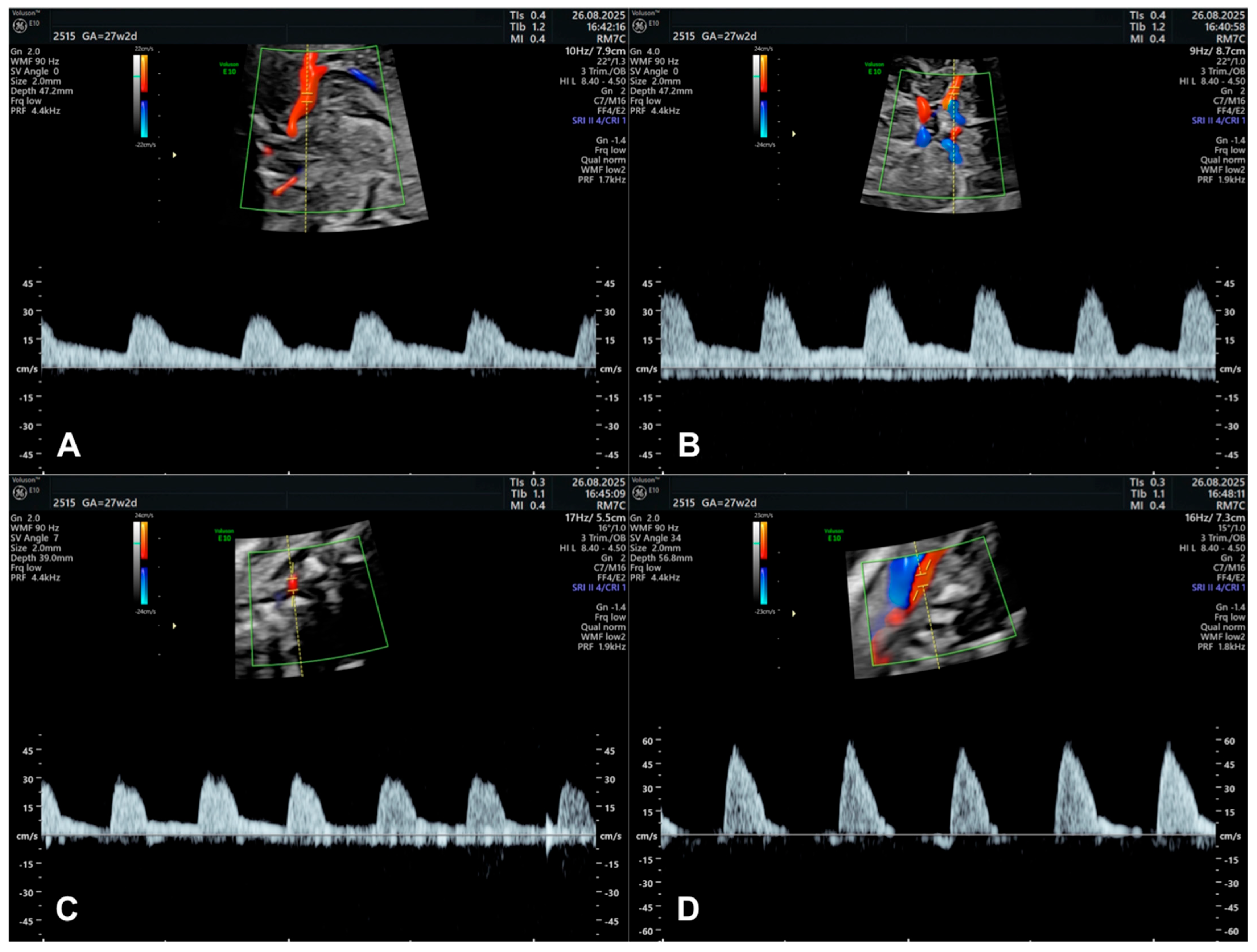 - Bhide, A.; Acharya, G.; Baschat, A.; Bilardo, C.M.; Brezinka, C.; Cafici, D.; Ebbing, C.; Hernandez-Andrade, E.; Kalache, K.; Kingdom, J.; et al. ISUOG Practice Guidelines (updated): Use of Doppler velocimetry in obstetrics. Ultrasound Obstet. Gynecol. 2021, 58, 331–339. [Google Scholar] [CrossRef]