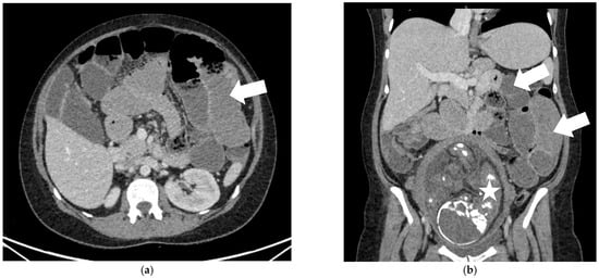 CT scan results 12 days after appendectomy (31 weeks + 4 days) (a) Axial CT scan (portovenous phase) showing distended small bowel loops (white arrow)—small bowel obstruction. (b) Coronal CT reconstruction (portovenous phase) showing distended small bowel loops (white arrows), fetus (white star).