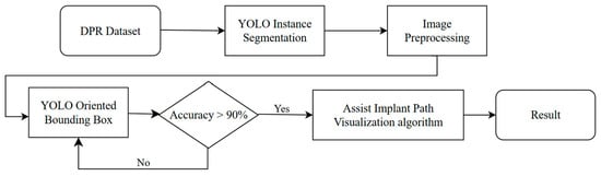 This section introduces the proposed automated auxiliary technique for implant pathway orientation detection on DPR. The overall research workflow is shown in Figure 1. We used two types of YOLO models, and with the visualized implant pathway orientation evaluation technique developed in this work, these models are employed to perform the detection of missing teeth and determine the preliminary implant pathway orientation.