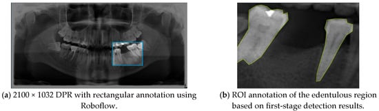 The database was annotated by five senior dentists, each representing one of the participating teams, all of whom had more than five years of clinical implantology experience. To ensure rigor, only DPRs with a single-tooth edentulous site and two adjacent neighboring teeth were included, while cases involving multiple missing teeth or periodontal bone loss in both adjacent teeth (with potential need for extraction) were excluded. Each senior dentist performed the annotations independently, without influence from others, and the final ground truth was determined through majority voting to guarantee consistency and reliability. In the annotation stage, the Roboflow annotation tool labeled the edentulous regions and the two adjacent teeth with rectangular bounding boxes (Figure 2a), serving as the basis for subsequent evaluation. In the second stage, the YOLO-based cropped outputs and segmented DPR subsets were used for region of interest (ROI) annotation and training (Figure 2b), enabling the derivation of optimal implant placement pathways.