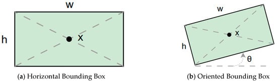 Bounding Box used in YOLO detection. (a) Horizontal Bounding Box (HBB); (b) Oriented Bounding Box (OBB). Here, x represents the center point of the bounding box, w and h denote the width and height of the box, and θ indicates the rotation angle of the oriented bounding box. The dashed lines represent the diagonal axes of each box, and the arrow denotes the direction of rotation used for the angle θ.