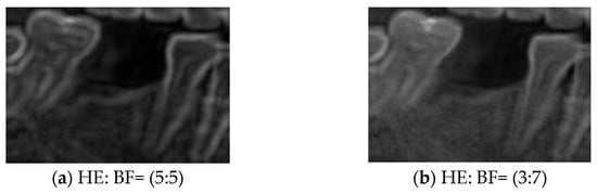 Histogram Equalization (HE) was applied to address the issues of uneven contrast and brightness in the original images. HE is commonly used in image enhancement cases involving low contrast or concentrated grayscale distributions. The computational procedure typically involves calculating the grayscale histogram of the original image, deriving the cumulative distribution function (CDF), and using the CDF as a mapping function to generate the enhanced image. The principle of this method is to redistribute the pixel intensity values of the image, thereby achieving a more uniform distribution of grayscale levels [40]. This approach improved overall contrast and detail visibility in this study. The transformation function of HE is defined in (6). Specifically, represents the output grayscale value, is the original pixel value, L denotes the total number of gray levels, and is the probability of occurrence of the j-th grayscale level. This study used two categories of images for training: BF images and enhanced images obtained through image processing. By applying HE and blending it with BF images at varying degrees, composite images (HE: BF) were generated. This approach improves the model’s adaptability to diverse clinical conditions of dental morphology, thereby enhancing its generalization performance and robustness against interference, as illustrated in Figure 6.