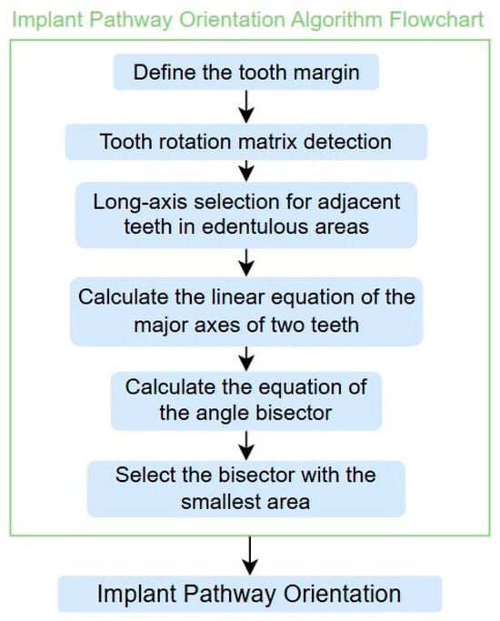 The angle bisector of the two auxiliary lines was then calculated using the angle bisector formula shown in (8), where (, , ) and (, , ) represent the coefficients of the two lines. The resulting internal angle bisector defines the preliminary implant pathway orientation derived by this framework. This bisector represents the most stable implant pathway orientation direction, ensuring that the implant avoids adjacent teeth and critical anatomical structures while maximizing bone–implant contact area. Such orientation enhances osseointegration stability and prevents complications from improper angulation, such as malocclusion or uneven stress distribution. The visualization of this process and the algorithmic design are presented in Figure 8. Finally, the auxiliary pathway generated by the algorithm was compared and overlapped with the implant pathway orientation annotated by dentists on the images to evaluate the predictive capability and accuracy of the model. The overlap results serve as a basis for further model optimization and provide valuable reference information for clinical application.