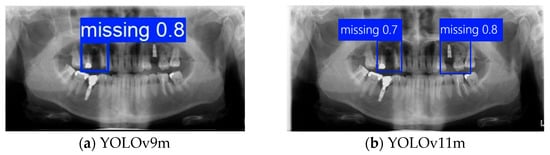 Further analysis revealed that although YOLOv11m performed slightly better on specific metrics, it was more prone to detection box shifts or overlaps in test images with complex backgrounds or blurred tooth boundaries, leading to reduced segmentation accuracy. As shown in Figure 10b, YOLOv11m produced detections with higher confidence scores; however, the predicted locations often deviated from the actual tooth positions. In contrast, Figure 10a illustrates that YOLOv9m, despite yielding slightly lower confidence scores, achieved superior localization accuracy with fewer false positives. This advantage was particularly evident in challenging cases involving blurred edges or narrow interdental spacing, where YOLOv9m consistently delivered stable predictions. The detection boxes generated by YOLOv9m provided higher accuracy and adhered more closely to the actual tooth contours, demonstrating greater stability and practical applicability. These strengths make YOLOv9m more suitable for subsequent fine-grained image segmentation and detailed dental structure analysis. Therefore, YOLOv9m was ultimately selected as the primary model for the following experiments, and all further applications and performance evaluations were conducted based on its outputs.