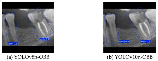 Although YOLOv10n-OBB demonstrated a slight advantage in overall classification accuracy, YOLOv8n-OBB achieved a relatively higher mAP50–95 of 78.75%. Furthermore, as illustrated in Figure 12, YOLOv8n-OBB generated predictions with higher confidence scores, and its detection boxes more comprehensively encompassed critical surrounding structures of the teeth, including both the crown and root regions. In contrast, YOLOv10n-OBB, despite exhibiting better classification accuracy, often produced detection boxes with insufficient coverage or positional deviations, which could compromise the accuracy and stability of subsequent localization and contour segmentation tasks. Considering both model performance and practical image application, the stable and reliable predictions provided by YOLOv8n-OBB better meet the requirements of fine-grained dental feature recognition. Moreover, its robustness is advantageous for downstream applications such as auxiliary line generation and implant pathway orientation.