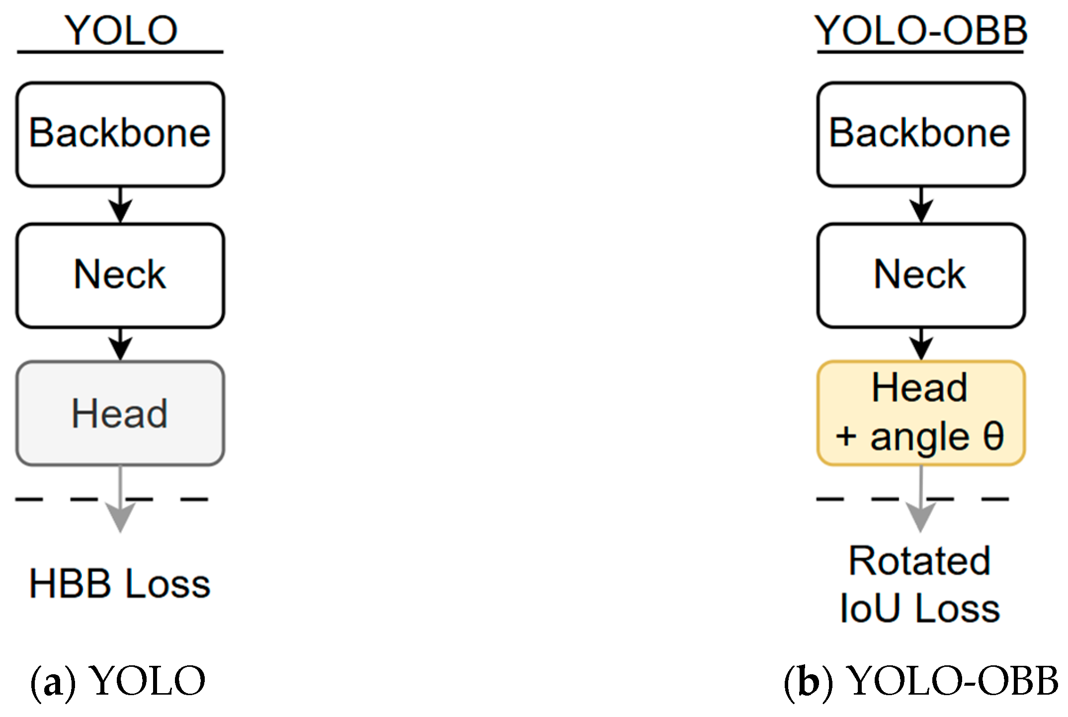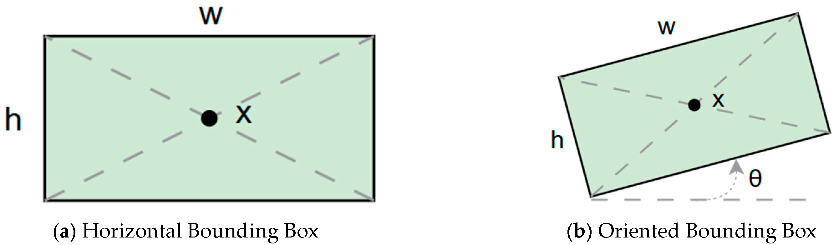 - Zand, M.; Etemad, A.; Greenspan, M. Oriented Bounding Boxes for Small and Freely Rotated Objects. IEEE Trans. Geosci. Remote Sens. 2022, 60, 1–15. [Google Scholar] [CrossRef]